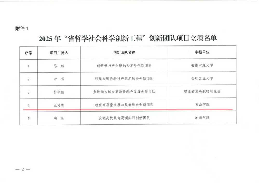 近日,安徽省社会科学界联合会公布了2025年度“省哲学社会科学创新工程”优秀青年人才及创新团队入选名单,黄山学院汪海彬教授主持的“教育高质量发展与数智融合创新团队”成功入选。
